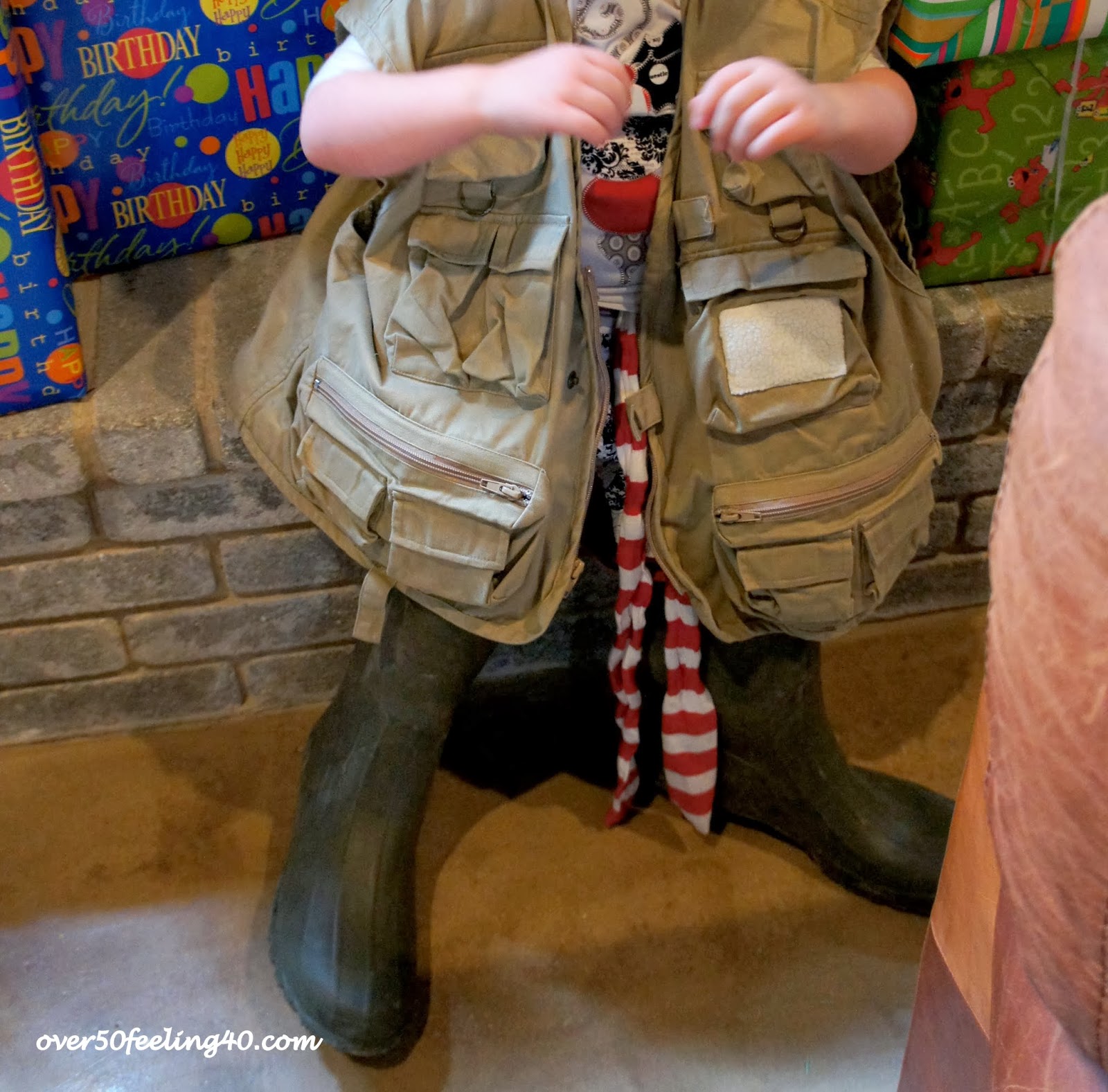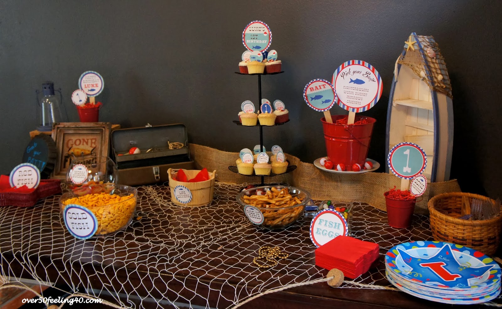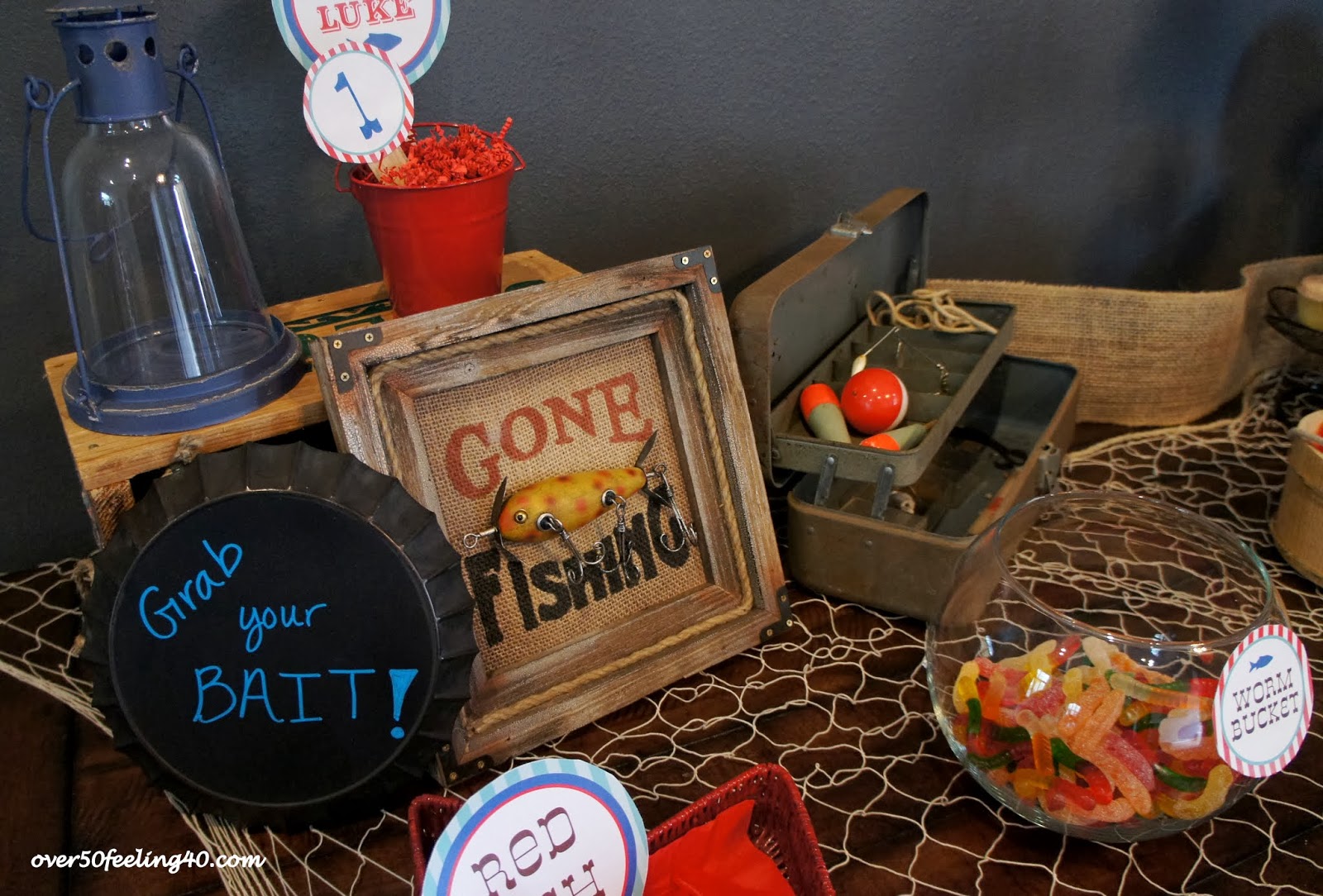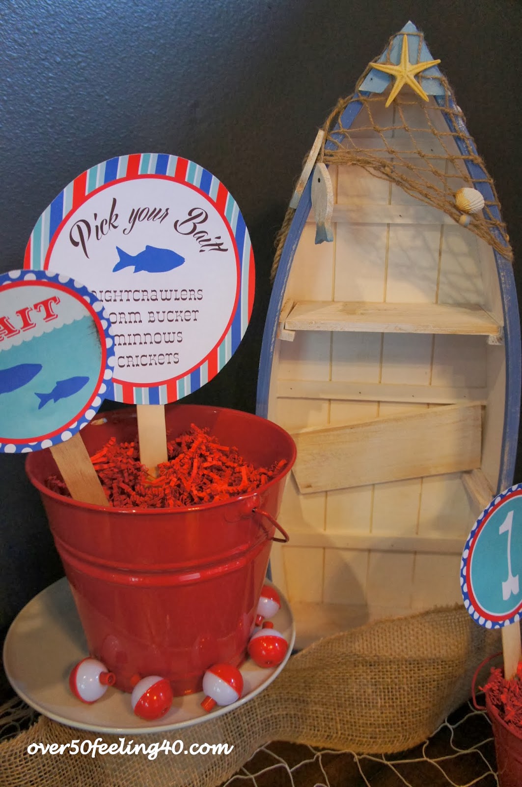 The photo area included a sheet on the wall with a fisherman's net over it. Guests could dress in funny hats, fishing boots, fishing vests, etc. and pose for pictures....really cute!